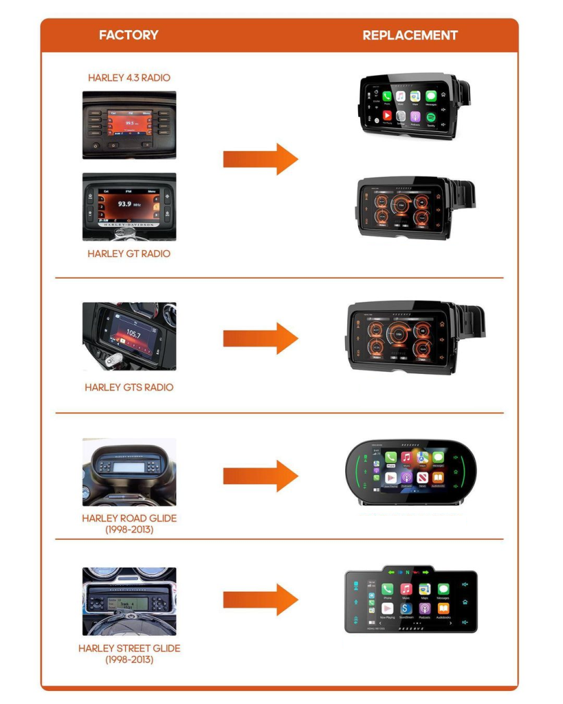 Plug-n-Play upgrade autoradio voor Road Glide 1998 / 2013 Harley Davidson® Touring met Apple CarPlay®, Android Auto®